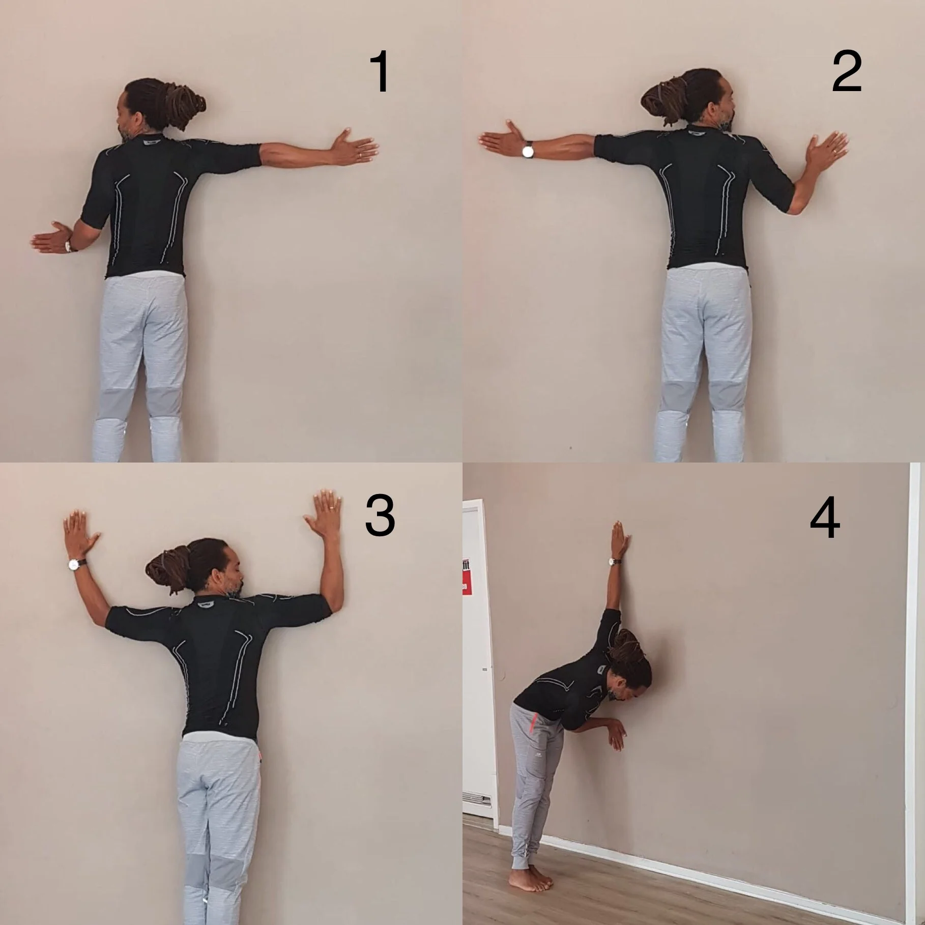 WITH YOUR BACK TIGHT TO THE WALL, ARMS, AND ELBOWS, THE WALL ALSO LEADS TO RAISE YOUR ARMS ON THE WALL AND DOWN.